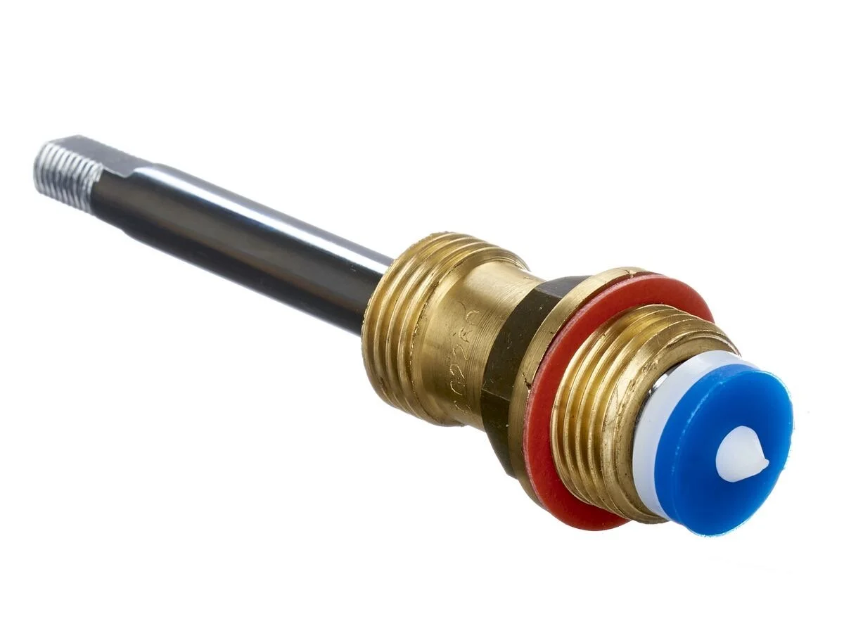 • Brass stem with threaded metal components and a blue and white circular tip, used in plumbing or related hardware applications.